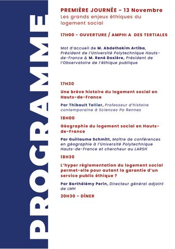 La première journée, ouverte par Abdelhakim Artiba, Président de l'UPHF et René Dosière, Président de l’Observatoire de l’éthique publique, sera consacrée aux grands enjeux éthiques du logement social à travers des interventions de chercheurs et d’experts tels que Thibault Tellier (Sciences Po Rennes), Guillaume Schmitt (UPHF) et Barthélémy Perin (Lille Métropole Habitat).