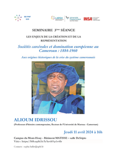 - 16h-18h : Alioum IDRISSOU Professeur d’histoire contemporaine, Recteur de l’Université de Maroua - Cameroun intitulée Société carcérales et domination européenne au Cameroun : 1884-1960 (Aux origines historiques de la crise du système camerounais)