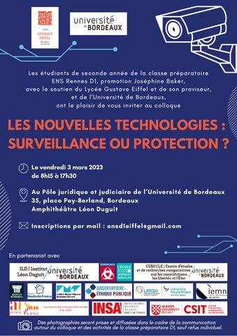 Les étudiants de seconde année de la classe préparatoire ENS Rennes D1 et de l'Université de Bordeaux, ont le plaisir de vous inviter au colloque "LES NOUVELLES TECHNOLOGIES : SURVEILLANCE OU PROTECTION ?"