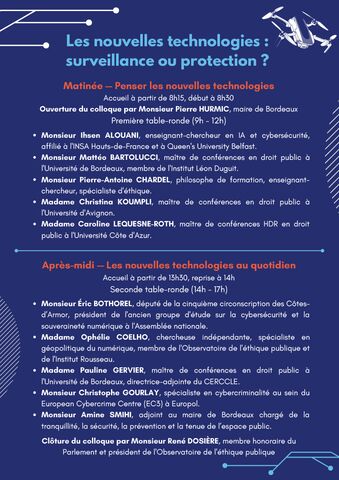 Le colloque "LES NOUVELLES TECHNOLOGIES : SURVEILLANCE OU PROTECTION ?" duquel l'UPHF est partenaire, se déroulera le vendredi 3 mars 2023 au Pôle juridique et judiciaire de l'Université de Bordeaux, 35 place Pey-Berland, Bordeaux, amphithéâtre Léon Duguit.