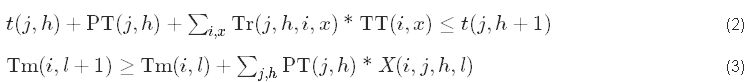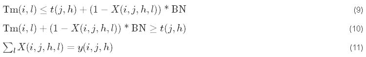 These constraints are the link between the variables: operation/job starting time and operation/machine starting time ((9) and (10)); and the link between the allocation of operations to machines and the order in which the operations are processed by the machines (11)