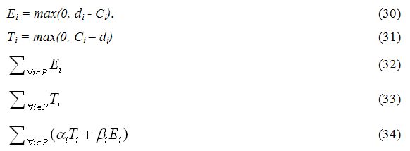 Earliness and Tardiness of jobs is the comparison of the actual completion time of jobs with the desired completion time. The earliness of a job i is the positive difference between the due date and the completion time (eq. 30). In the opposite way, the tardiness Ti of a job i is the positive difference between the completion time and the due date(eq. 31) . Different criteria can be minimized: the amount of earliness (eq. 32), the amount of tardiness (eq. 33) or both criteria (eq. 34, or its quadratic form).