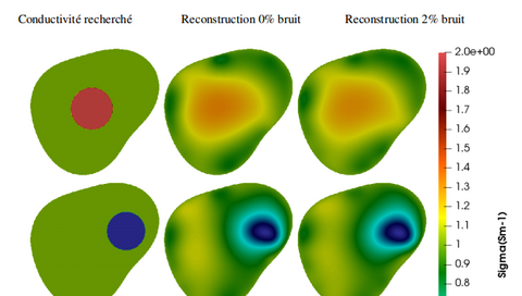 Le problème en imagerie médicale est intitulé "Tomographie par impédance électrique", où l'objectif est de reconstruire la conductivité dans le volume d'un domaine à partir de mesures effectuées sur le torse à l'aide d'une ceinture d'électrodes. Pour ce problème, nous proposons une méthode de frontière immergée par différences finies. Nous discuterons de la convergence de cette méthode, ainsi que des premières études d'analyse de sensibilité menées actuellement pour le problème direct.