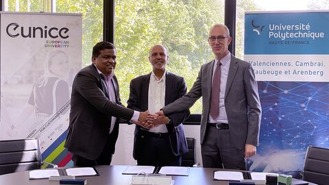 The President of the UPHF, Abdelhakim Artiba, the INSA Hauts-de-France Director, Armel de la Bourdonnaye and Professor Bikramjit Basu, representing the Registrar Capt. Sridhar Warrier (Retd.), of the Indian Institute of Science (IISc) of Bangalore, signed a collaboration agreement in Valenciennes, this July 5th.