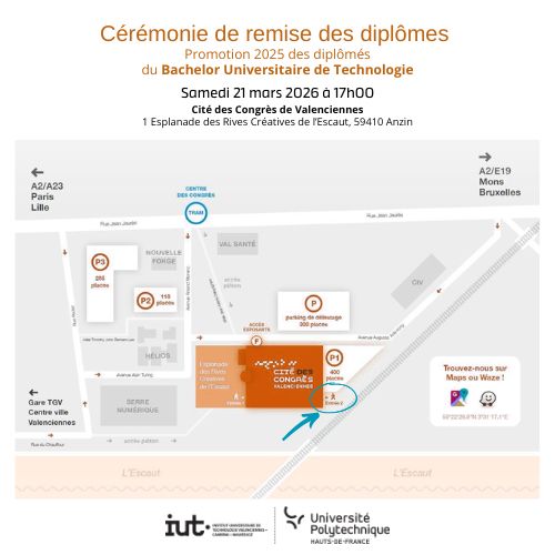 Chers diplômés de la Promotion 2025, l'IUT de Valenciennes-Cambrai-Maubeuge est heureux de vous convier à votre cérémonie de remise des diplômes, à la Cité des Congrès de Valenciennes.