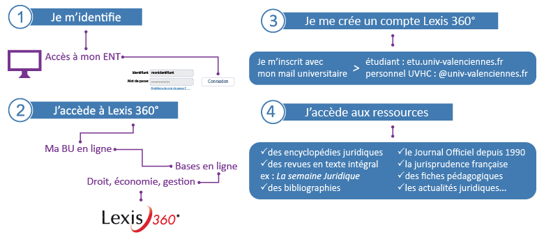 En décembre, la base de sciences juridiques Lexis Nexis Jurisclasseur a fermé au profit de Lexis 360°. Ce nouveau portail inclut le contenu de l’ancienne base ainsi que quelques nouveautés, notamment des fiches pédagogiques, très pratiques pour les étudiants en droit. Pour vous familiariser avec Lexis 360°, n’hésitez pas à en parler à vos bibliothécaires ou à consulter les nombreux tutoriels vidéo disponibles sur Internet. Attention, pour accéder au contenu, il faut nécessairement vous inscrire avec votre mail universitaire (en "@etu.univ-valenciennes.fr" pour les étudiants, en "@univ-valenciennes.fr" pour le personnel de l'université). Cela ne nécessite pas de mot de passe.