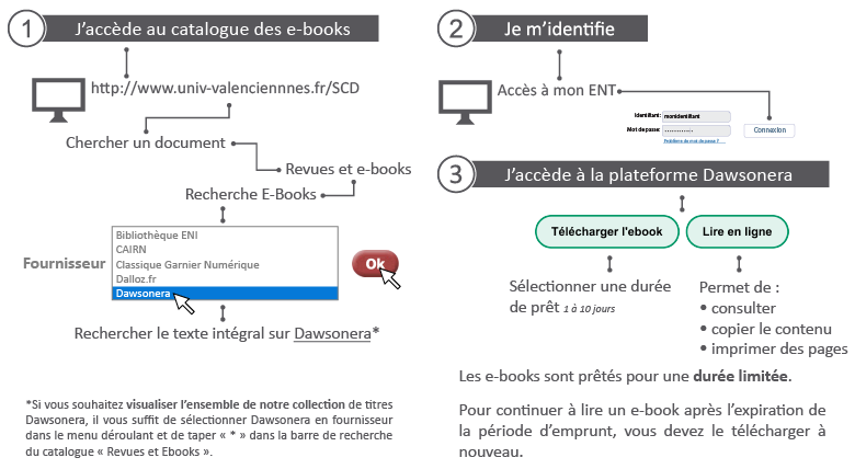 Dawsonera est notre plateforme centrale d’e-books : toutes les disciplines y sont représentées (majoritairement de niveau licence et en français). Autrement dit, vous y trouvez aussi bien des livres sur le BIM ou sur Louis XIV que des manuels de DCG. Son enrichissement est constant et la bibliothèque peut acheter de nouveaux e-books de manière pérenne tout au long de l’année. Nous en possédons déjà presque 300. Comment y accéder ?