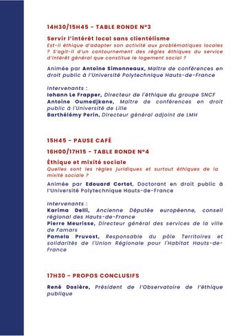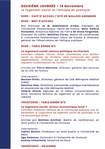 La première journée, ouverte par Abdelhakim Artiba, Président de l'UPHF et René Dosière, Président de l’Observatoire de l’éthique publique, sera consacrée aux grands enjeux éthiques du logement social à travers des interventions de chercheurs et d’experts tels que Thibault Tellier (Sciences Po Rennes), Guillaume Schmitt (UPHF) et Barthélémy Perin (Lille Métropole Habitat).