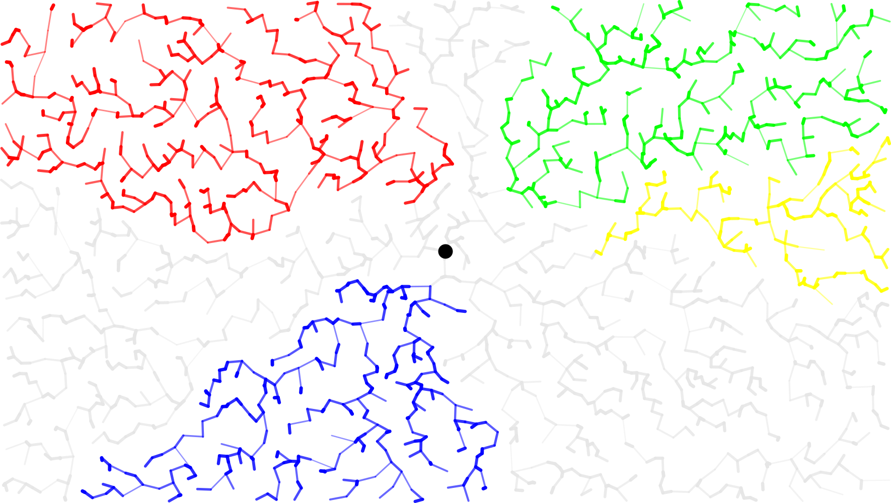 The Radial Spanning Tree is a geometric graph defined by a simple, deterministic local rule on a random infinite set of points in Euclidean space. It forms almost surely a locally finite rooted tree, prompting several natural questions: How many infinite branches are there? Do they admit asymptotic directions? Which limits are possible? How many distinct infinite branches can share the same one? In this talk, we will review how these questions were addressed in the two-dimensional case. Then, we will present recent progress that makes it possible to investigate higher dimensions, where previous approaches failed due to the loss of planarity.