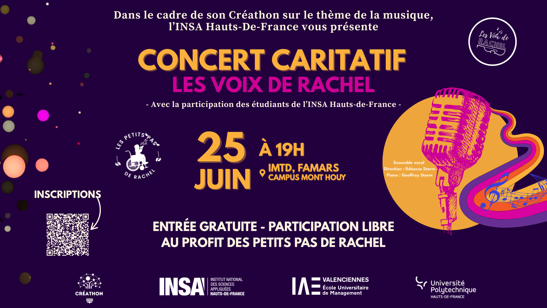 Cet événement musical, organisé par l’INSA Hauts-de-France dans le cadre du Créathon 2025, avec la participation de nos étudiant·e·s, est proposé en collaboration avec l’ensemble vocal « Les Voix de Rachel », de l’association « Les Petits Pas de Rachel ».