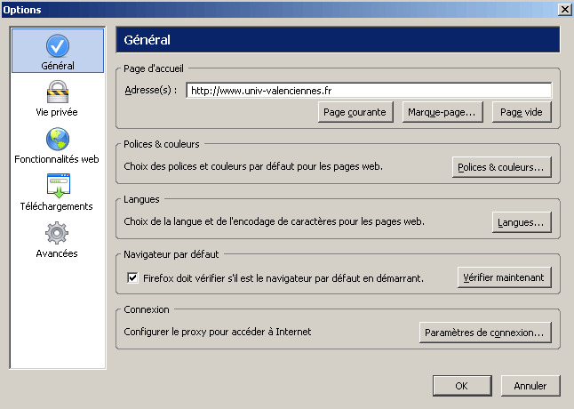 2. Cliquer sur le bouton "Général" dans la colonne de gauche puis sur le bouton "Paramètres de connexion..." (cf fig.2)