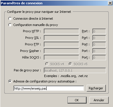 3. Sélectionner l'option "Adresse de configuration proxi automatique" puis entrer si vous êtes: