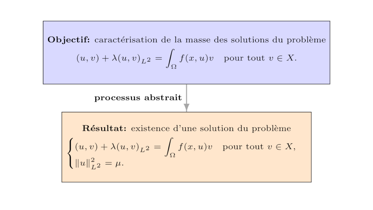 El enfoque clásico consiste en transformar el problema de la existencia de una solución en la búsqueda de un punto crítico de una funcional, llamada energía, restringida al conjunto de funciones de norma L2 fija. Obtenemos así una solución de una ecuación en la que aparece un término lineal con un multiplicador de Lagrange. La falta de conocimiento explícito de este multiplicador de Lagrange conduce a dificultades en ciertos casos.