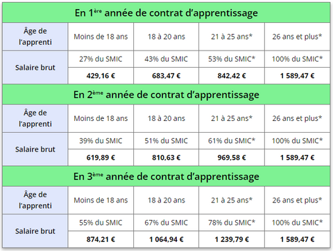 - De 26 ans à plus : 100% du SMIC / salaire le + élevé entre le SMIC et le salaire minimum conventionnel correspondant à l'emploi occupé pendant le contrat d'apprentissage.