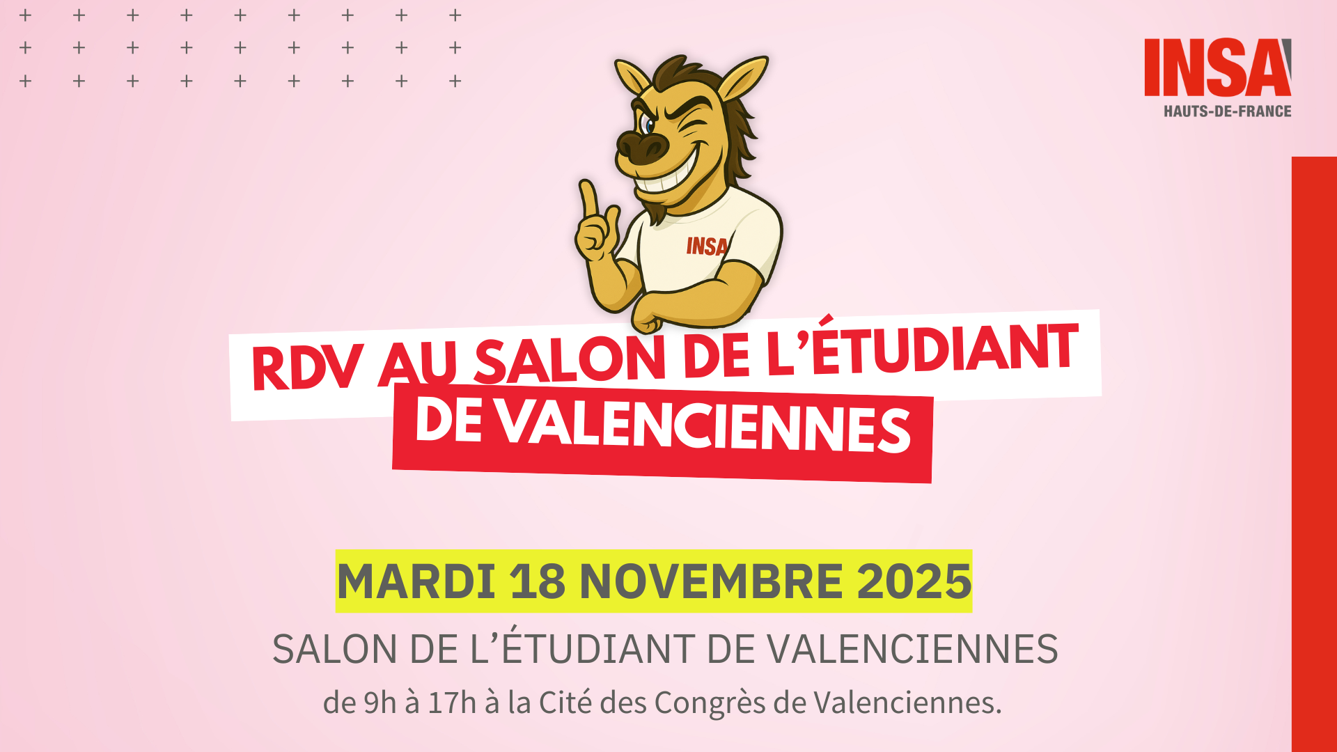 Retrouvez l’INSA Hauts-de-France au Salon de l’Étudiant de Valenciennes, le mardi 18 novembre 2025, de 9h à 17h, à la Cité des Congrès de Valenciennes, et découvrez nos formations d’ingénieur·e·s ainsi que nos parcours en sciences et technologies.