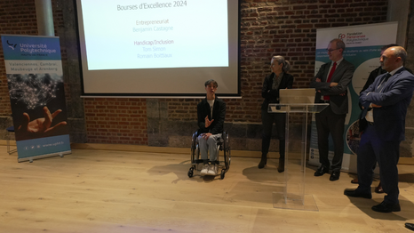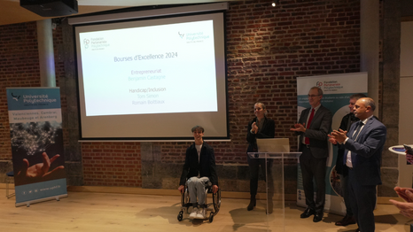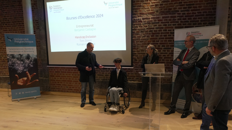 Romain Boittiaux, étudiant en licence STAPS Activité Physique Adaptée et Santé (APAS) s’est vu attribuer le 16 décembre 2024 une Bourse Handicap Inclusion par la Fondation Partenariale Polytechnique Hauts-de-France pour son projet en présence du Président de l'université Abdelhakim Artiba et de son tuteur Guillaume RICHARD, directeur des Sports STAPS à l’IT2S.