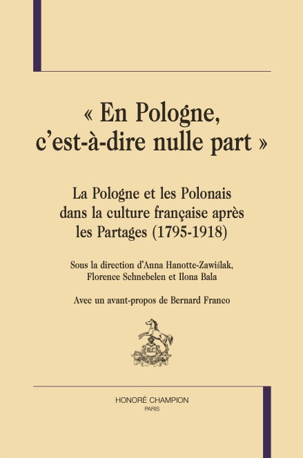 « En Pologne, c’est-à-dire nulle part », la Pologne et les Polonais dans la culture française à l’époque des partages 1795-1918 (dir. Anna Hanotte-Zawiślak, Florence Schnebelen et Ilona Bala), Paris, Honoré Champion, coll. « Bibliothèque d’études de l’Europe centrale », 2025.