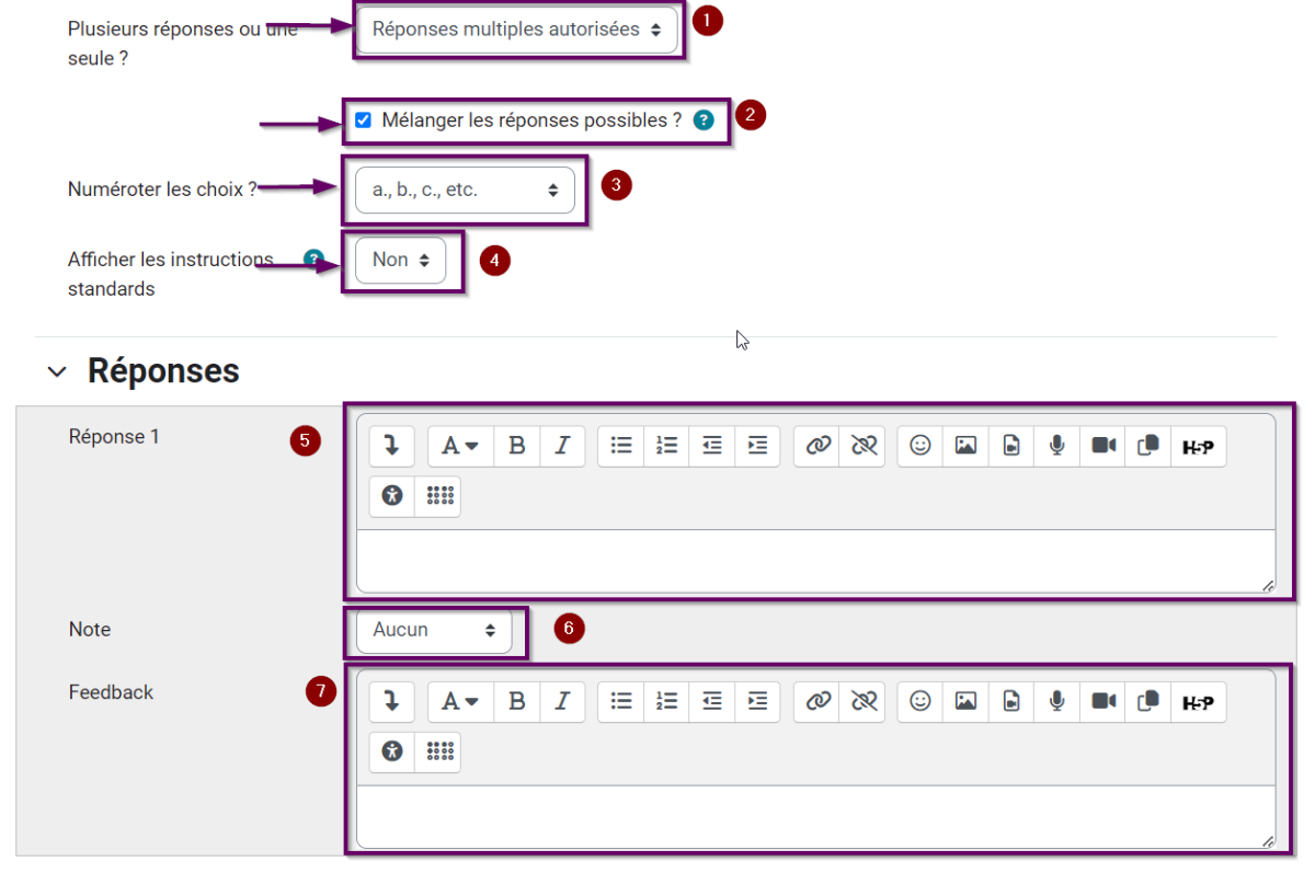 - Le feedback permet de faire un retour à l’étudiant en cas de sélection de la réponse.